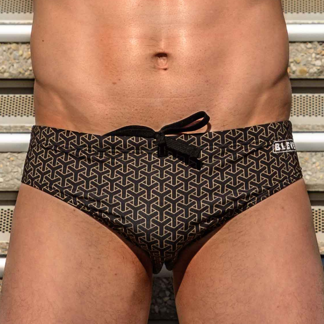 Bring unapologetic charm to the beach or poolside with our sleek Black ‘n Gold Geo swim briefs. The geometric print adds a contemporary, artistic touch to the classic silhouette, while the gold accents reflect and shine in the sunlight. The smooth recycled polyester fabric is both comfortable and quick-drying, making these perfect for hours of swimming. Sustainably made and durable, these swim briefs are the ultimate choice for style and functionality.