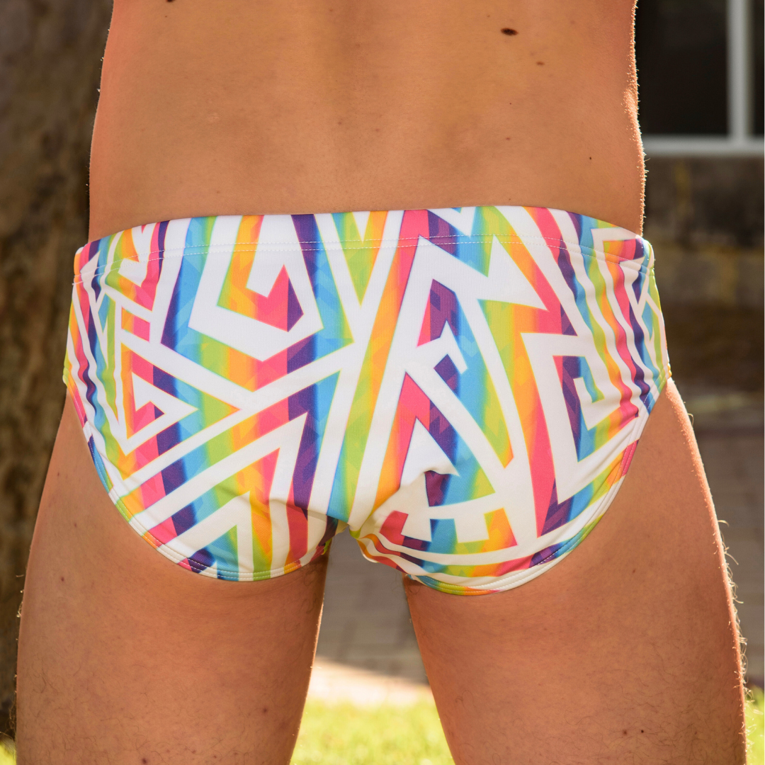 Get ready to make a splash this summer with our new men's swimwear in a fun rainbow pattern! Made from recycled materials, these swim briefs are not only stylish but also eco-friendly.
