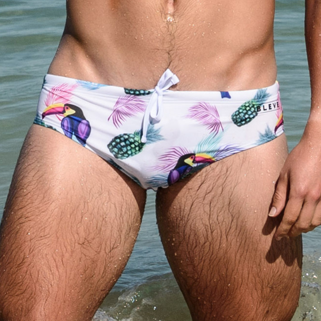 Escape to the tropics any time with these head-turning Toucan Tropic swim briefs. The durable, lightweight recycled polyester fabric will keep you cool and comfortable as you soak up the sun, while the colorful print of toucans and pineapples adds tropical flair to your beach style. The full coverage, drawstring closure, and breathable lining provide maximum support and a reliable fit, making them great for active days in the water.